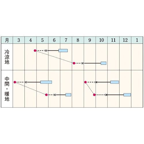 - 花期、収穫期(○○どり)、高さ、収穫重量などの性質は、一般平坦地における適期栽培でのおおよその目安です。