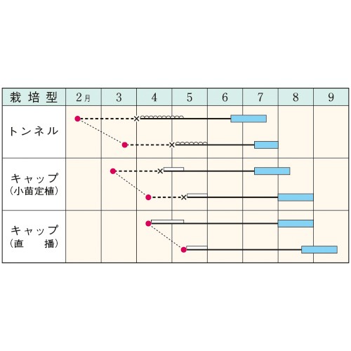- 花期、収穫期(○○どり)、高さ、収穫重量などの性質は、一般平坦地における適期栽培でのおおよその目安です。