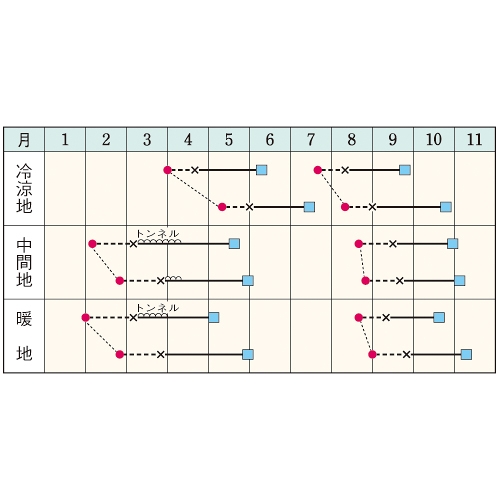 - 花期、収穫期(○○どり)、高さ、収穫重量などの性質は、一般平坦地における適期栽培でのおおよその目安です。