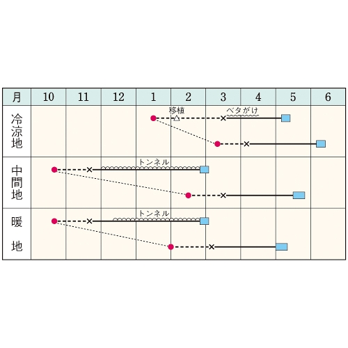 - 花期、収穫期(○○どり)、高さ、収穫重量などの性質は、一般平坦地における適期栽培でのおおよその目安です。