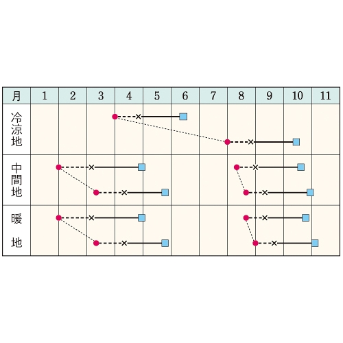 - 花期、収穫期(○○どり)、高さ、収穫重量などの性質は、一般平坦地における適期栽培でのおおよその目安です。