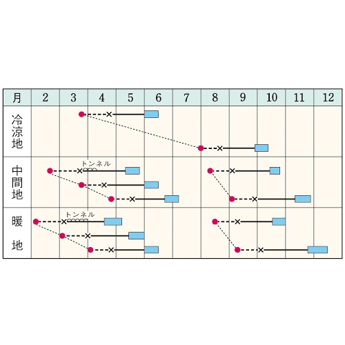 - 花期、収穫期(○○どり)、高さ、収穫重量などの性質は、一般平坦地における適期栽培でのおおよその目安です。