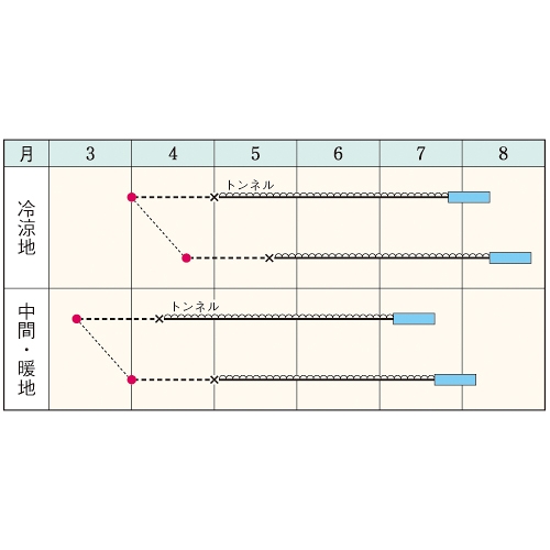 - 花期、収穫期(○○どり)、高さ、収穫重量などの性質は、一般平坦地における適期栽培でのおおよその目安です。