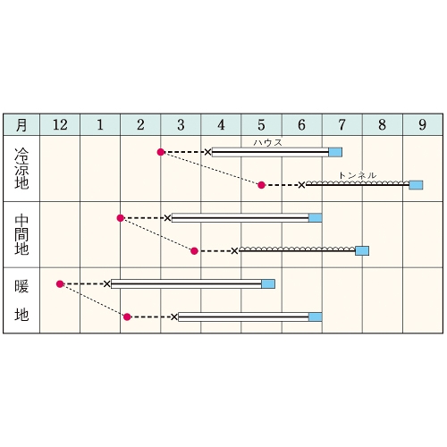 - 花期、収穫期(○○どり)、高さ、収穫重量などの性質は、一般平坦地における適期栽培でのおおよその目安です。