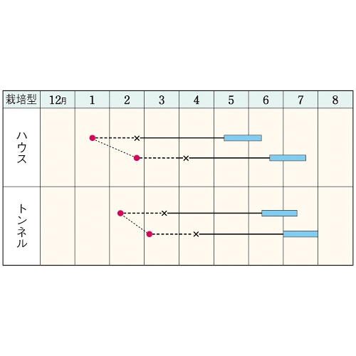 - 花期、収穫期(○○どり)、高さ、収穫重量などの性質は、一般平坦地における適期栽培でのおおよその目安です。