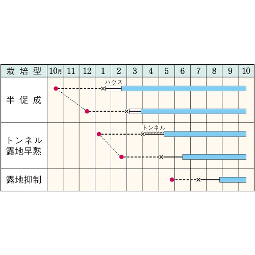 - 花期、収穫期(○○どり)、高さ、収穫重量などの性質は、一般平坦地における適期栽培でのおおよその目安です。