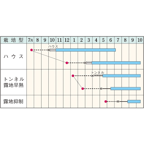 - 花期、収穫期(○○どり)、高さ、収穫重量などの性質は、一般平坦地における適期栽培でのおおよその目安です。