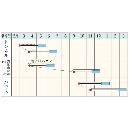 - 花期、収穫期(○○どり)、高さ、収穫重量などの性質は、一般平坦地における適期栽培でのおおよその目安です。