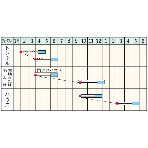 - 花期、収穫期(○○どり)、高さ、収穫重量などの性質は、一般平坦地における適期栽培でのおおよその目安です。