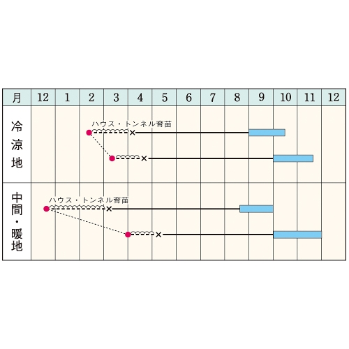 - 花期、収穫期(○○どり)、高さ、収穫重量などの性質は、一般平坦地における適期栽培でのおおよその目安です。