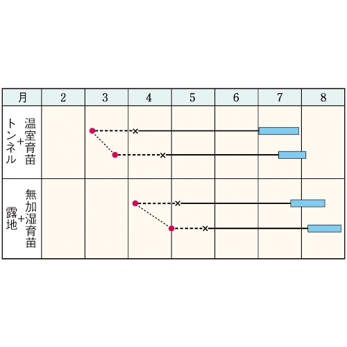 - 花期、収穫期(○○どり)、高さ、収穫重量などの性質は、一般平坦地における適期栽培でのおおよその目安です。