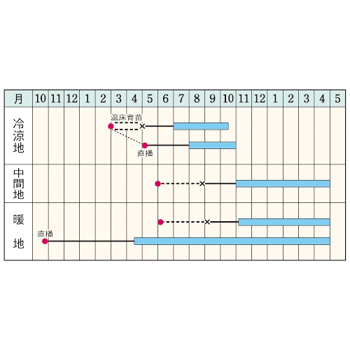 - 花期、収穫期(○○どり)、高さ、収穫重量などの性質は、一般平坦地における適期栽培でのおおよその目安です。
