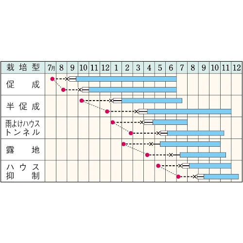 - 花期、収穫期(○○どり)、高さ、収穫重量などの性質は、一般平坦地における適期栽培でのおおよその目安です。