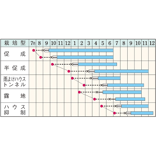 - 花期、収穫期(○○どり)、高さ、収穫重量などの性質は、一般平坦地における適期栽培でのおおよその目安です。
