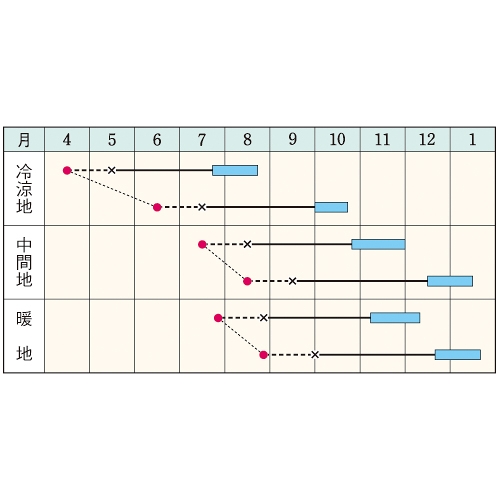 - 花期、収穫期(○○どり)、高さ、収穫重量などの性質は、一般平坦地における適期栽培でのおおよその目安です。