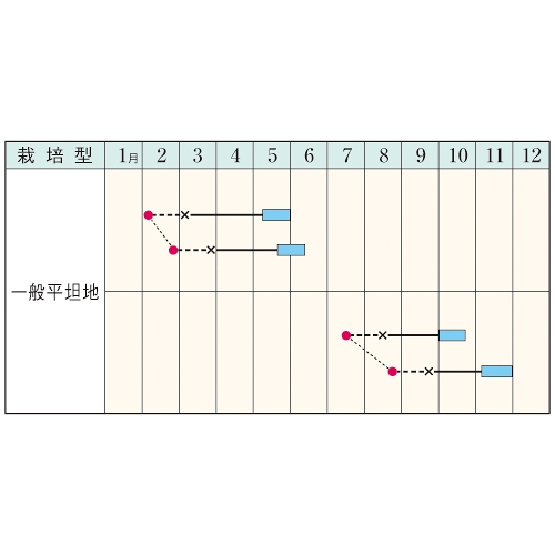 - 花期、収穫期(○○どり)、高さ、収穫重量などの性質は、一般平坦地における適期栽培でのおおよその目安です。