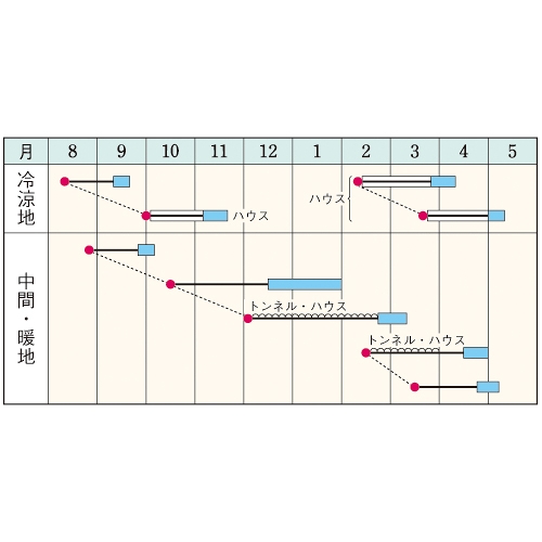 - 花期、収穫期(○○どり)、高さ、収穫重量などの性質は、一般平坦地における適期栽培でのおおよその目安です。