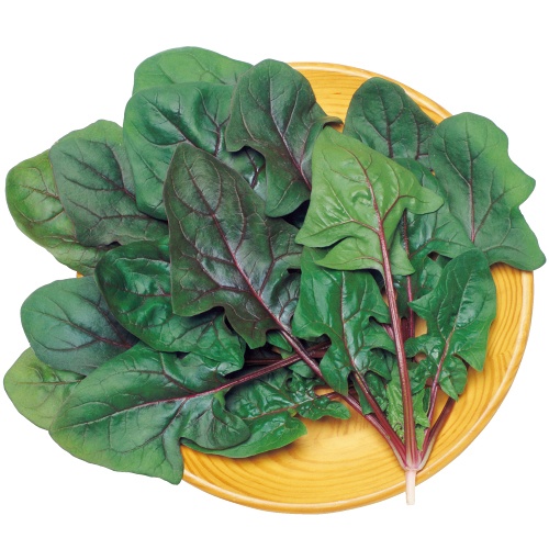 低温伸長性に優れ、秋冬どりに向く赤軸種。葉柄・葉脈が鮮紅色で、アクが少なく、サラダなどの彩りに適する。(丸粒種)