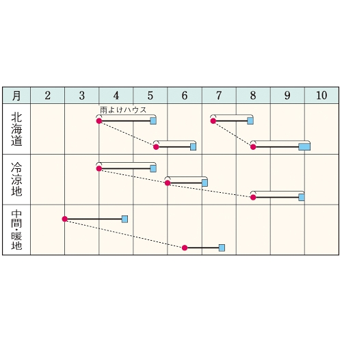 - 花期、収穫期(○○どり)、高さ、収穫重量などの性質は、一般平坦地における適期栽培でのおおよその目安です。