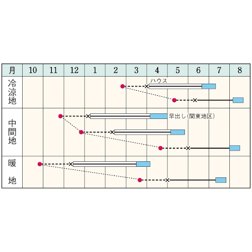 - 花期、収穫期(○○どり)、高さ、収穫重量などの性質は、一般平坦地における適期栽培でのおおよその目安です。