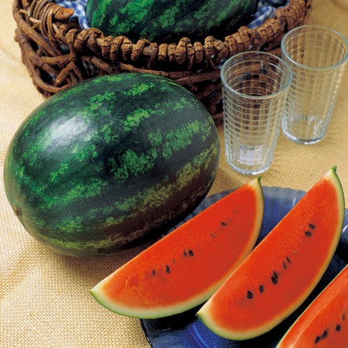 幅広い縞をもつ枕形のユニークな外観。肉質はかためで、歯ざわりのよい食感が楽しめる。日もちがよく、裂果の心配も少なく、着果が安定し作りやすい。