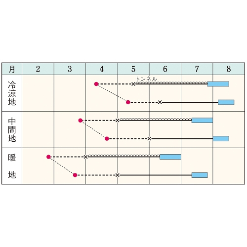 - 花期、収穫期(○○どり)、高さ、収穫重量などの性質は、一般平坦地における適期栽培でのおおよその目安です。