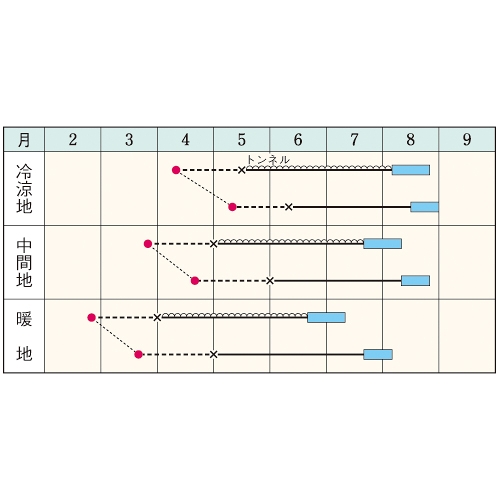 - 花期、収穫期(○○どり)、高さ、収穫重量などの性質は、一般平坦地における適期栽培でのおおよその目安です。