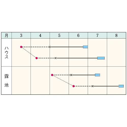 - 花期、収穫期(○○どり)、高さ、収穫重量などの性質は、一般平坦地における適期栽培でのおおよその目安です。