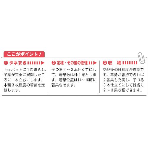 草勢が比較的強い品種で着果期前に蔓の葉による過繋茂にならぬようチッソ質の肥料の過度の使用を避け追肥中心に栽培管理を行う。低温期での栽培時には着果性が落ちるため栽培は避ける。