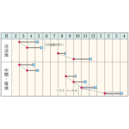 - 花期、収穫期(○○どり)、高さ、収穫重量などの性質は、一般平坦地における適期栽培でのおおよその目安です。
