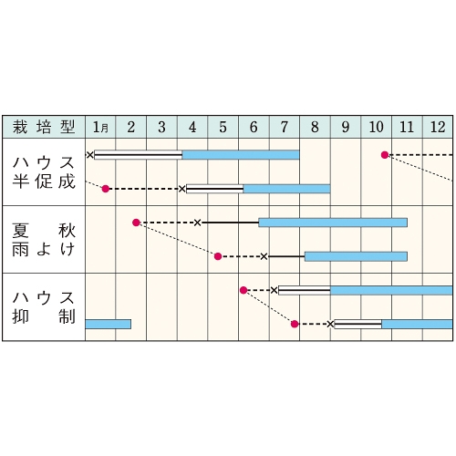 - 花期、収穫期(○○どり)、高さ、収穫重量などの性質は、一般平坦地における適期栽培でのおおよその目安です。