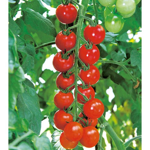 ミニトマトの代表品種。糖度が高く、肉質は緻密で、食味が大変よい。低段からの食味も優れるうえ、果揃いもよく、たくさん収穫できる。
