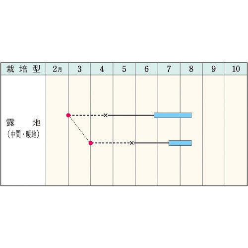 - 花期、収穫期(○○どり)、高さ、収穫重量などの性質は、一般平坦地における適期栽培でのおおよその目安です。