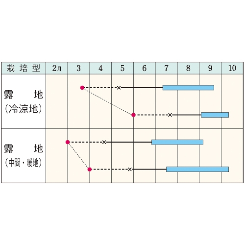 - 花期、収穫期(○○どり)、高さ、収穫重量などの性質は、一般平坦地における適期栽培でのおおよその目安です。