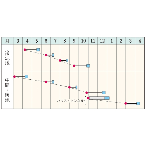 - 花期、収穫期(○○どり)、高さ、収穫重量などの性質は、一般平坦地における適期栽培でのおおよその目安です。
