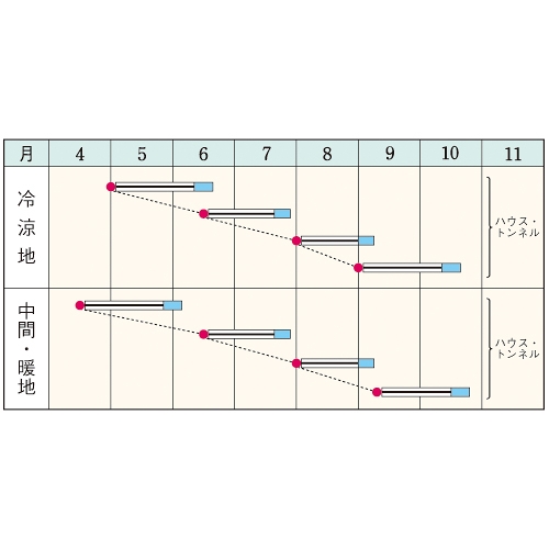 - 花期、収穫期(○○どり)、高さ、収穫重量などの性質は、一般平坦地における適期栽培でのおおよその目安です。