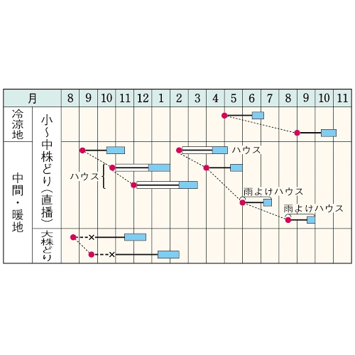 - 花期、収穫期(○○どり)、高さ、収穫重量などの性質は、一般平坦地における適期栽培でのおおよその目安です。
