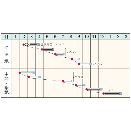 - 花期、収穫期(○○どり)、高さ、収穫重量などの性質は、一般平坦地における適期栽培でのおおよその目安です。