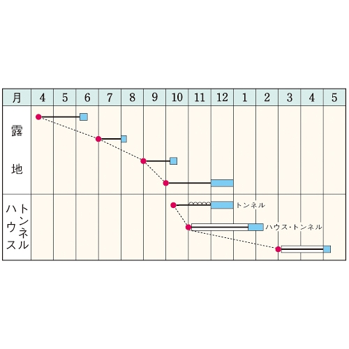 - 花期、収穫期(○○どり)、高さ、収穫重量などの性質は、一般平坦地における適期栽培でのおおよその目安です。