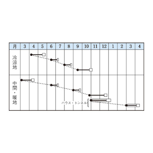- 花期、収穫期(○○どり)、高さ、収穫重量などの性質は、一般平坦地における適期栽培でのおおよその目安です。