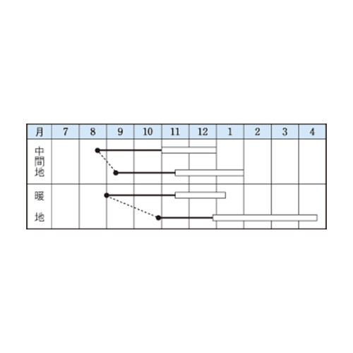 - 花期、収穫期(○○どり)、高さ、収穫重量などの性質は、一般平坦地における適期栽培でのおおよその目安です。
