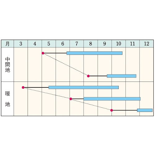 - 花期、収穫期(○○どり)、高さ、収穫重量などの性質は、一般平坦地における適期栽培でのおおよその目安です。
