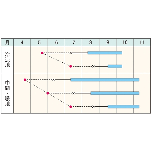 - 花期、収穫期(○○どり)、高さ、収穫重量などの性質は、一般平坦地における適期栽培でのおおよその目安です。