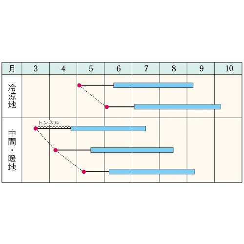 - 花期、収穫期(○○どり)、高さ、収穫重量などの性質は、一般平坦地における適期栽培でのおおよその目安です。