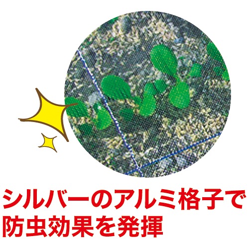 ポリエチレン製細糸採用で通気性に優れており、0.8mm目合いで虫の侵入を防止。10cm間隔のアルミ格子付き。(日本製)