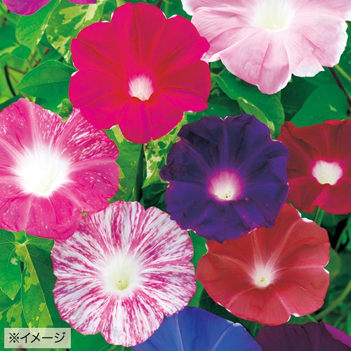 巨大輪咲きの混合。垣根や行灯仕立て、グリーンカーテンにとあらゆる用途に使える。