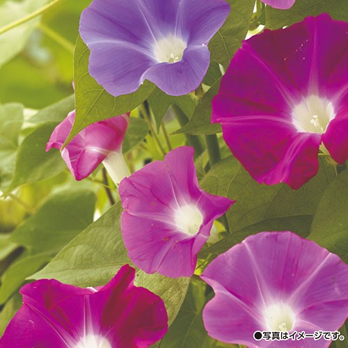 花の大きさは中大輪系。大変丈夫な性質で、つるの伸びもよく、作りやすい。花色は空色や淡桃色など、薄めの色彩も混じる混合品種。