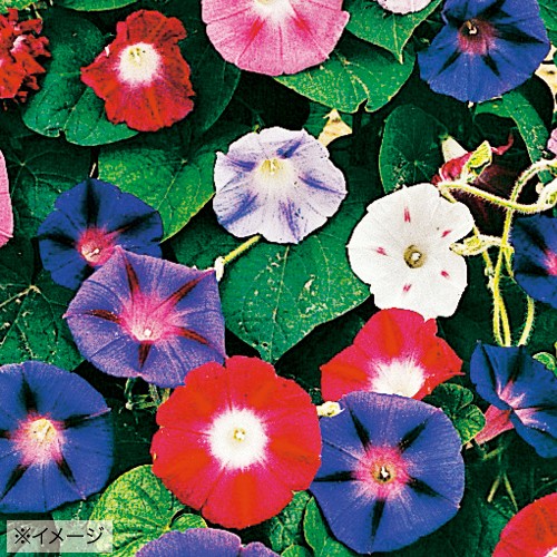 ユニークな花色を含む様々な西洋朝顔を混ぜたミックス。カラフルな花色が楽しめて生育が旺盛で、つるもよく伸び長期間咲き続ける。垣根やアーチなどを作るのに好適。