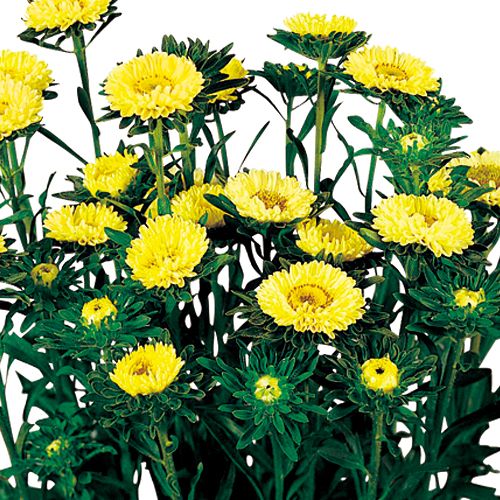 花径約5cmの中大輪黄花種。お盆やお彼岸向けにも好適。アスターは花もちがよく夏の切り花で重宝され、洋風アレンジにも欠かせない人気の花。連作を嫌うので、同じ場所で続けて栽培しないようにご注意を。キク科