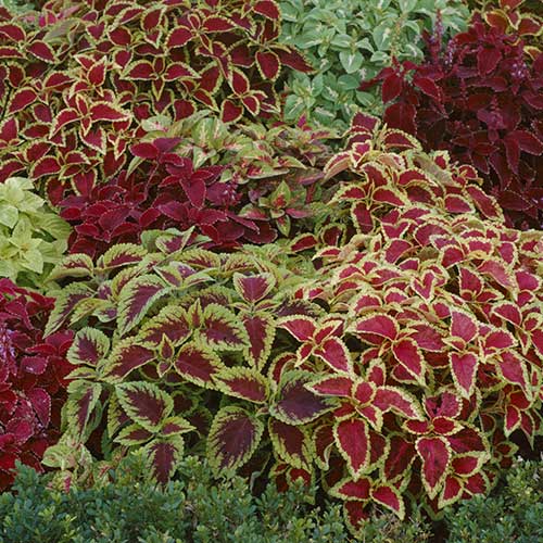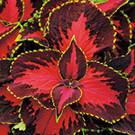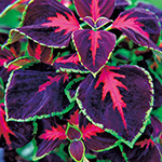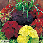 カラフルな色合いで、下の部分からよく枝分かれしてコンパクトにまとまる。寄せ植えの材料としても、コリウスだけの植え込みでも楽しめる。